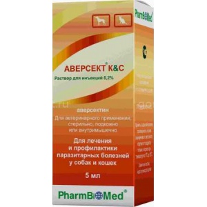 Аверсект К&С обладает широким спектром противопаразитарного действия, активен в отношении круглых червей Toxocara canis, Toxocara mystax, Toxascaris leonina, Uncinaria spp., Ancylostoma spp., Dirofilaria immitis, Trichuris vulpis, клещей Sarcoptes spp., Otodectes cynotis, Demodex canis, Notoedres spp. и насекомых Ctenocephalides spp., Linognathus spp., Trichodectes canis, паразитирующих на собаках и кошках. Механизм действия аверсектина С1 заключается в его воздействии на величину тока ионов хлора через мембраны нервных и мышечных клеток паразита.