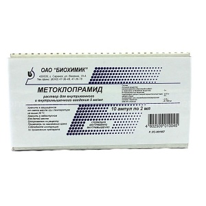 1 ампула (2 мл) содержит в качестве активного вещества метоклопрамида гидрохлорида моногидрат (в пересчете на метоклопрамида гидрохлорид) -10 мг.